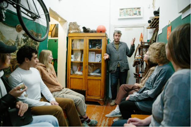 Исследовательская прогулка по музею с Егором Ларичевым и последующее обсуждение наслаивающихся контекстов советского коммунального быта в Коломне ХХ века и современного художественного производства.